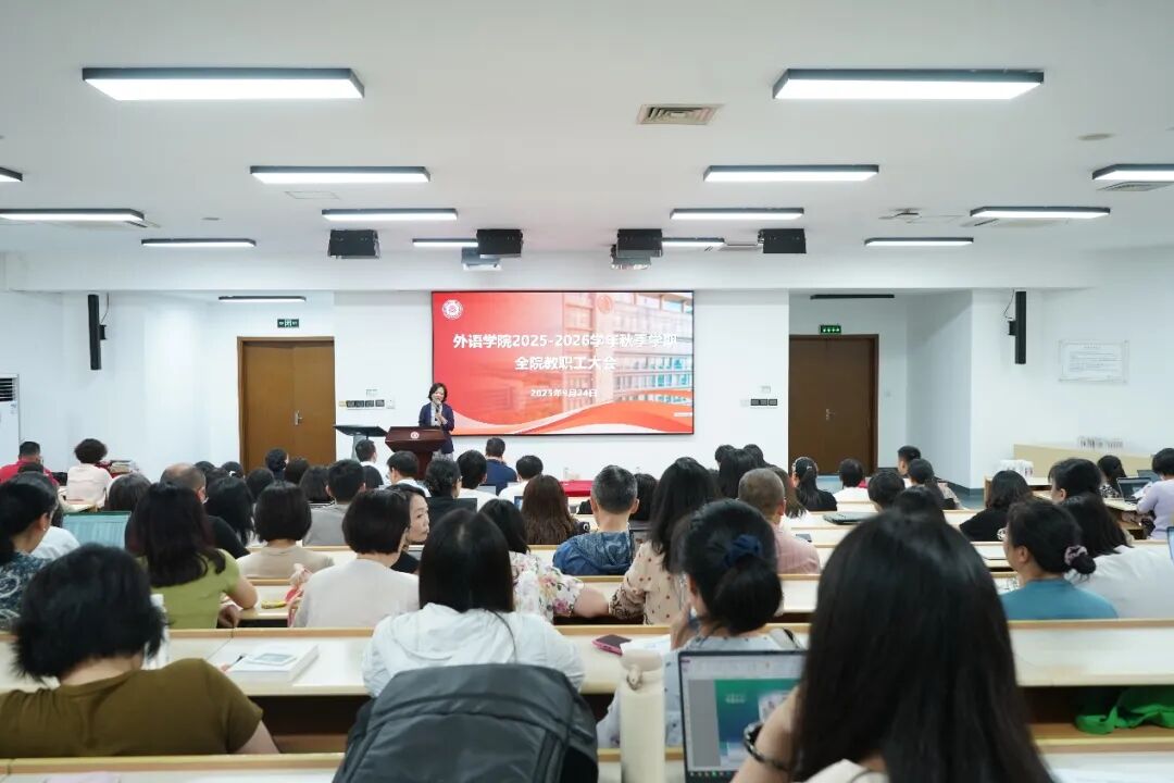 2025年9月24日,美女自慰 召开2025-2026学年秋季学期全院教职工大会。大会特邀原美女自慰外语系主任黄源深教授、人文与社会科学研究院院长吕志峰教授开展主题讲座,全体教职工参加。