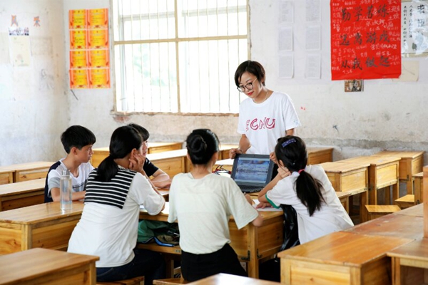 历经11小时40分钟的火车,一行21人跨越1010公里终于踏上了赣州这片土地,并得到了赣县教育局和江口中学的热情接待。经过一晚的休整,7月4日早上7点45分,18位志愿者第一次见到了近100位求知若渴的稚嫩脸庞。“环语宙"夏令营正式开幕。