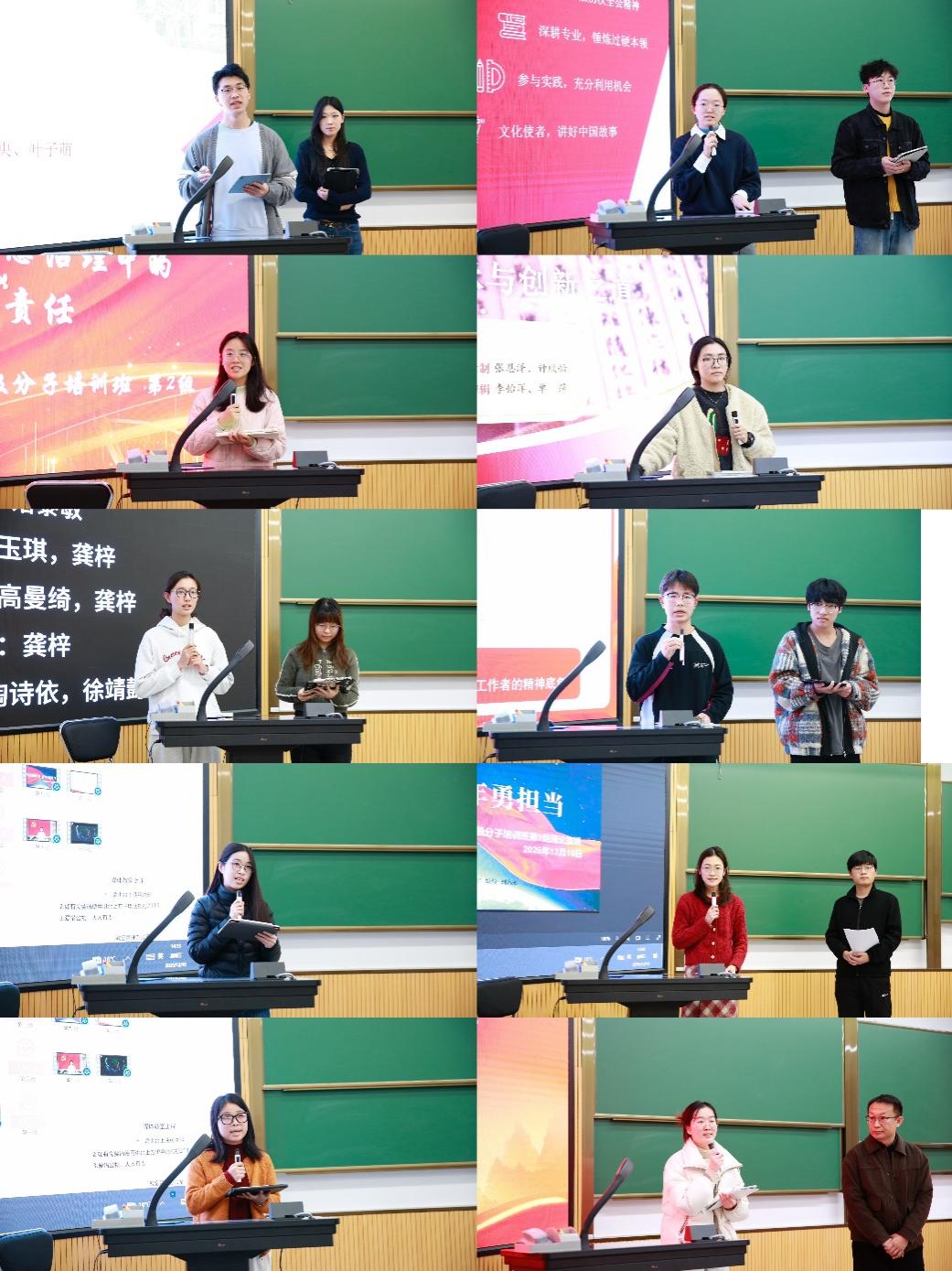 12月10日下午,培训班举办案例汇报与答辩展示环节。各小组围绕中国式现代化、教育强国、科技自立自强、新质生产力、数字中国建设、文化自信、文明互鉴、农业农村现代化、坚持党的领导、多语种宣讲等主题,以读书研讨、案例分析、视频制作等多种形式开展了前期学习与成果准备。在答辩环节,学员们结合所学理论,联系实际案例,进行了系统阐述与生动展示,体现出扎实的理论联系实际能力和良好的团队协作精神。美女自慰 特邀党建组织员侯敏跃教授,学院关工委成员、退休第一党支部书记丁兰兰老师,学术型研究生第三党支部副书记陈舒婷同学和本科生党支部组织委员兼纪检委员杜圣南同学担任评委,对学员们的案例汇报进行点评。