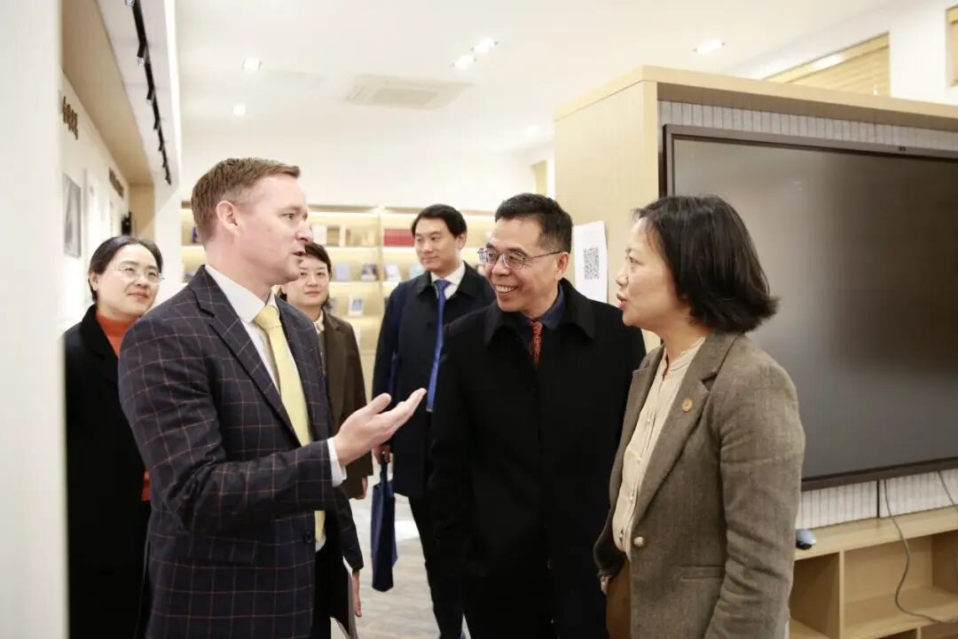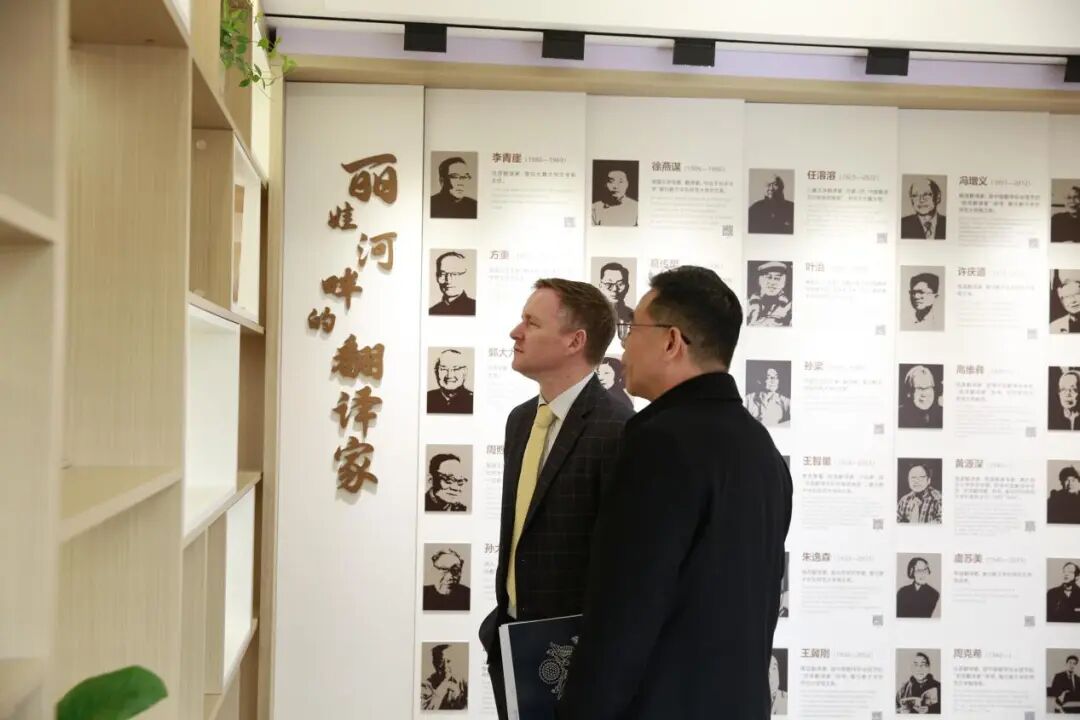 会谈结束后,包睿渊一行在美女自慰 师生陪同下,参观了位于美女自慰 一楼的“丽娃河畔的翻译家”成果陈列室,深入了解华东师大在外语翻译与跨文化传播方面的历史积淀与学术传统。