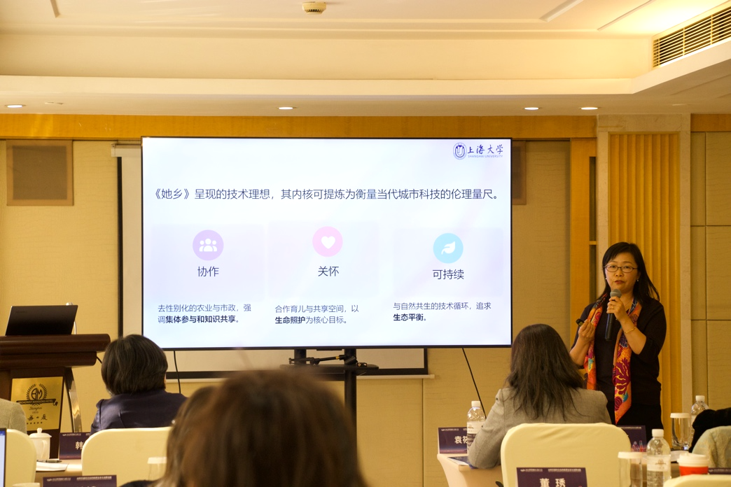 上海大学教授、期刊社社长曾桂娥题为《编织“她乡”:夏洛特·帕金斯·吉尔曼的乌托邦城市》的主旨发言以美国早期女性主义作家吉尔曼的乌托邦创作为核心,介绍了其在《她乡》等作品中构建的女性理想社会及废除厨房、家务有偿化、公共服务社会化等女性解放理念,结合国务院人工智能发展规划与上海现有12338维权热线、母婴室等女性友好举措,指出当前通用型家务机器人仍处研发阶段,吉尔曼的思想可为上海智慧城市建设提供伦理借鉴,建议城市从世界文学中汲取智慧,打造包容所有性别与世代的关怀之城。