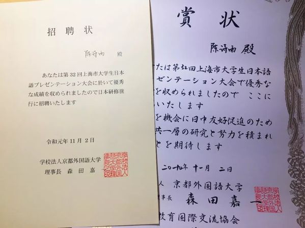 2019年11月2日,由上海教育国际交流协会、日本京都外国语大学共同主办的第32届上海市大学生日语才能演示大赛在东华大学圆满落下帷幕。日语系2016级本科生陈诗雨同学以优异的表现斩获亚军。