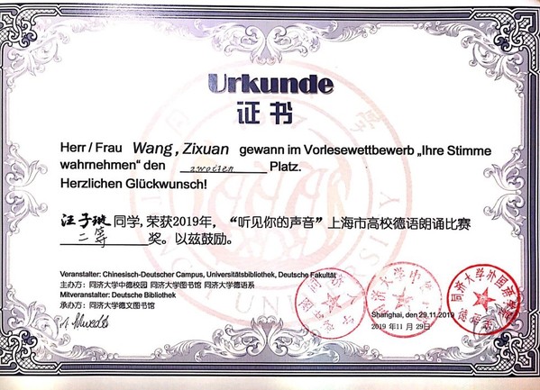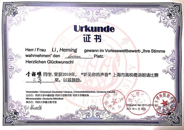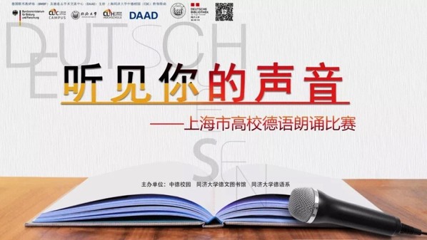 2019年11月29日,由同济大学中德校园、德文图书馆、德语系共同主办的“听见你的声音”上海市高校德语朗诵比赛决赛在同济大学四平路校区德文图书馆二楼报告厅拉开序幕。来自上海市十所高校的20位同学凭借优秀的德语朗诵能力,通过初赛的筛选,成功晋级决赛。决赛按照个人得分进行排名,决出一等奖1名,二等奖2名,三等奖3名,优胜奖6名。决赛选手成绩由专业评委(90%)和现场大众评委(10%)评分组成。我校德语系的汪子璇、李赫明、程珂青三位同学入围决赛,并分别获得二等奖、三等奖、优胜奖的好成绩,受到广泛关注与好评。