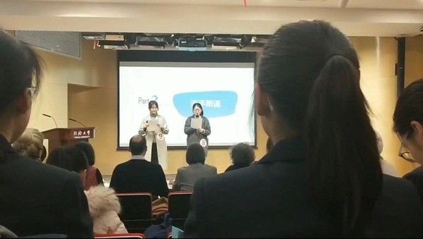 第二轮比赛开始前,晋级的12位选手被分为6组(2位编号相近的同学被分在一组),现场抽签决定朗读的散文篇目。此轮比赛考察的不仅是选手朗读长篇文本材料的流利性、德语的语音语调、选手对于文本内容的理解,更考察选手及其搭档的分工配合能力。最终评分仍为个人评分。我校三位同学深刻理解散文主旨,朗诵流畅,与搭档配合默契,终获评审广泛好评,获得殊荣。