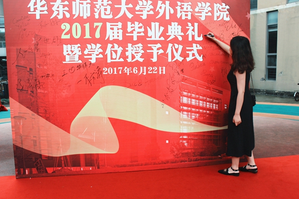 中午的红毯秀上,毕业生们戴上各种各样的头饰和“难忘的箭头”和朋友老师合影留念,走过红毯在背景板上签下名字,尽显迷人风采。纵使天公不作美,细雨蒙蒙,但每一位毕业生都抓住这最后的机会,记录下自己作为一名师大外院学生的模样。活泼与优雅,青春与成熟在红毯上完美交融,为大学四年美好生活增添一抹鲜亮的记忆。