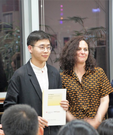 奥地利德语创意写作比赛每年举办一次,面向全国大中学学习德语的学生。本届比赛要求参赛者根据主办方事先设定的人物角色,创意构思并完成一个不超过1000字的德语迷你剧本。大赛组委会共收到来自14所学校的45份投稿,由独立评委会对参赛作品进行评判。在4月26日晚的颁奖会上,大赛主办方及评委会还与获奖同学一起欣赏了奥地利艺人Elias Hirschl, Jimmy Brainless带来的“砸诗烩”(Poetry Slam)表演,领略了奥地利诗歌文化的另一番风采。