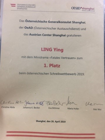 德语系2016级本科生凌颖从众多参赛者中脱颖而出,一举拔得该项赛事的头筹,荣获了大赛第一名。她创作的千字德语短剧《致命的信任》,凭借独特的构思和精准的语言,征服了五位评委。在颁奖现场,奥地利评委和演员对她的作品进行了精彩的演绎。